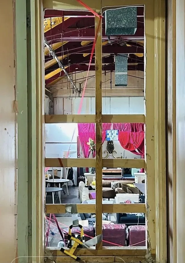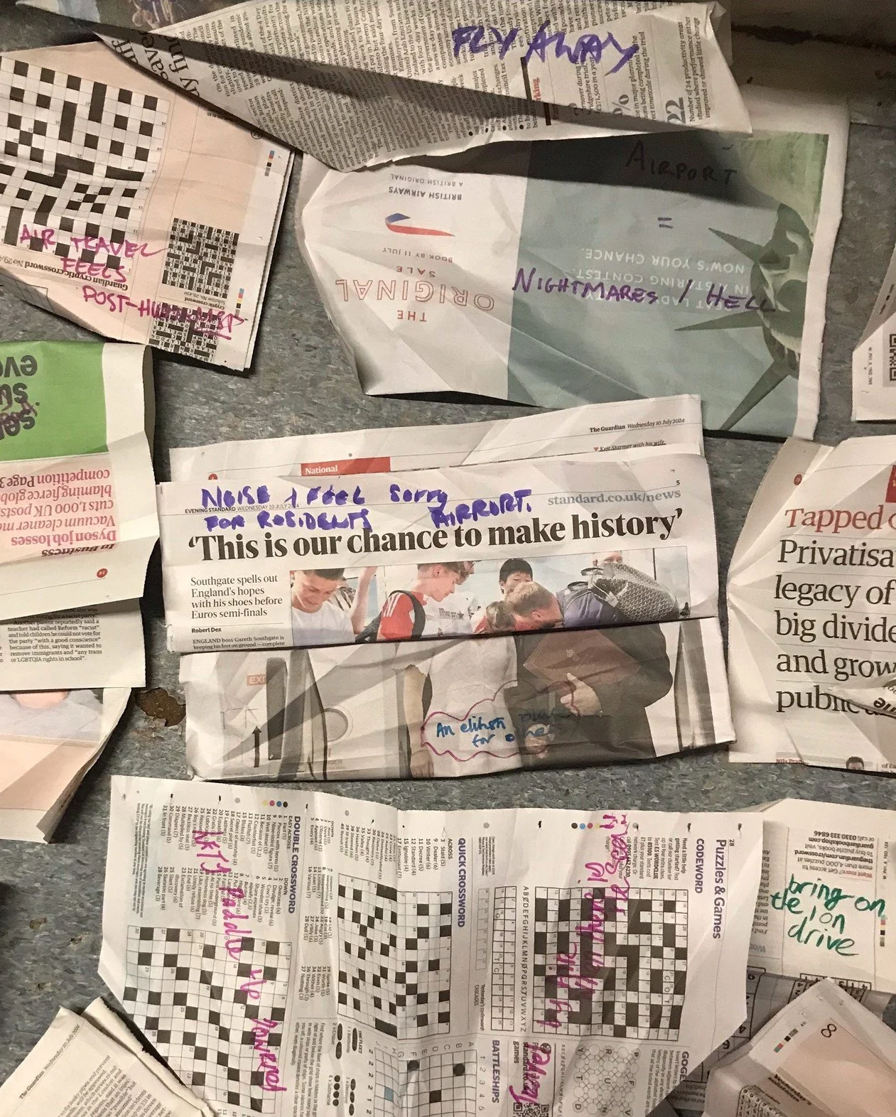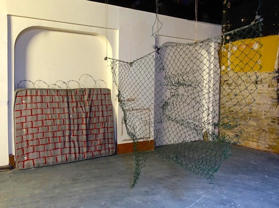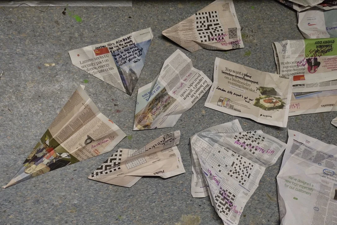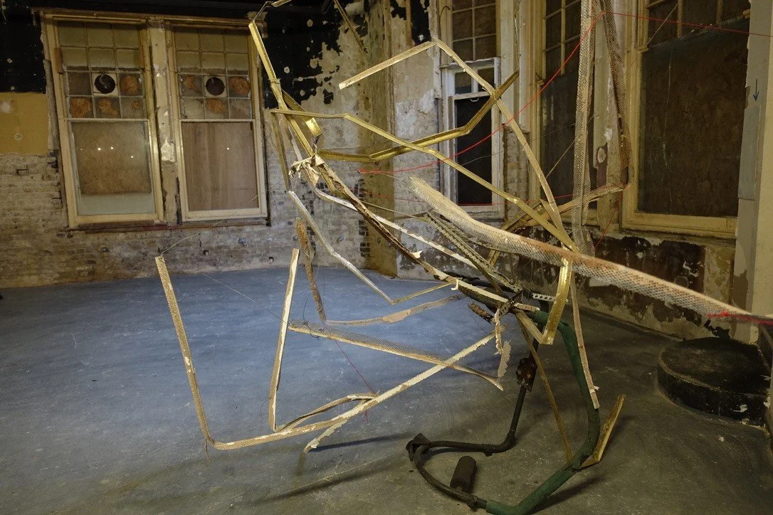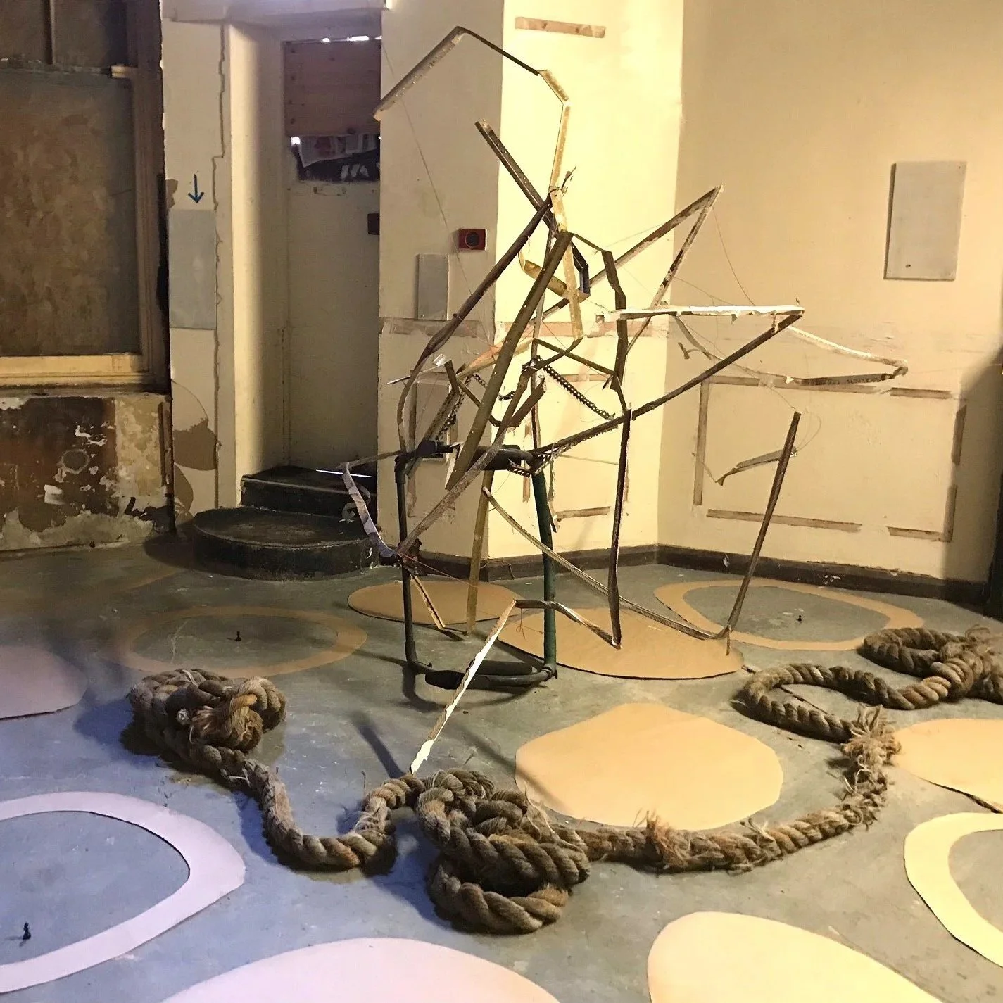 Since summer 2024, ReinsTate project has been transforming the historical Tate Institute building into an arts venue for the local community. Rachael Nicholson joined a 3-day artist takeover, with Melissa Pierce Murray and Jane Sarre, to create site-specific works and transform some of the internal spaces. Critiquing private property and land ownership in England, Nicholson used discarded materials found on-site to create ephemeral sculptural works. Perforated metal strips, old fencing and a discarded mattress were utilised to create artworks. Visitors were asked to write comments on paper aeroplanes about the nearby London City Airport before launching them into a room. As the building is opposite the immense Tate & Lyle sugar factory, there were also works referencing the slavery and colonisation behind the sugar industry.