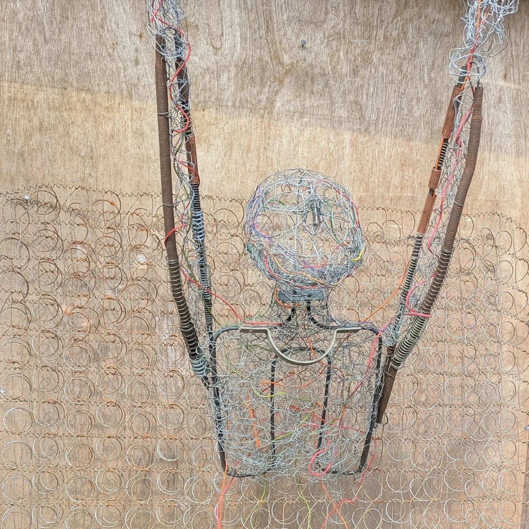 Made from salvaged materials including a mattress core, windscreen wipers, electrical cable and assorted springs, this piece was made for a shop window display on Lewes High Street to promote a local event. The figure is intentionally ambiguous, with references to ‘new life’ in Nature, the yoga asana known as ‘chair pose’ and the risen Christ. Shown in the former Lewes Tourist Office, April 11-22nd, 2025.