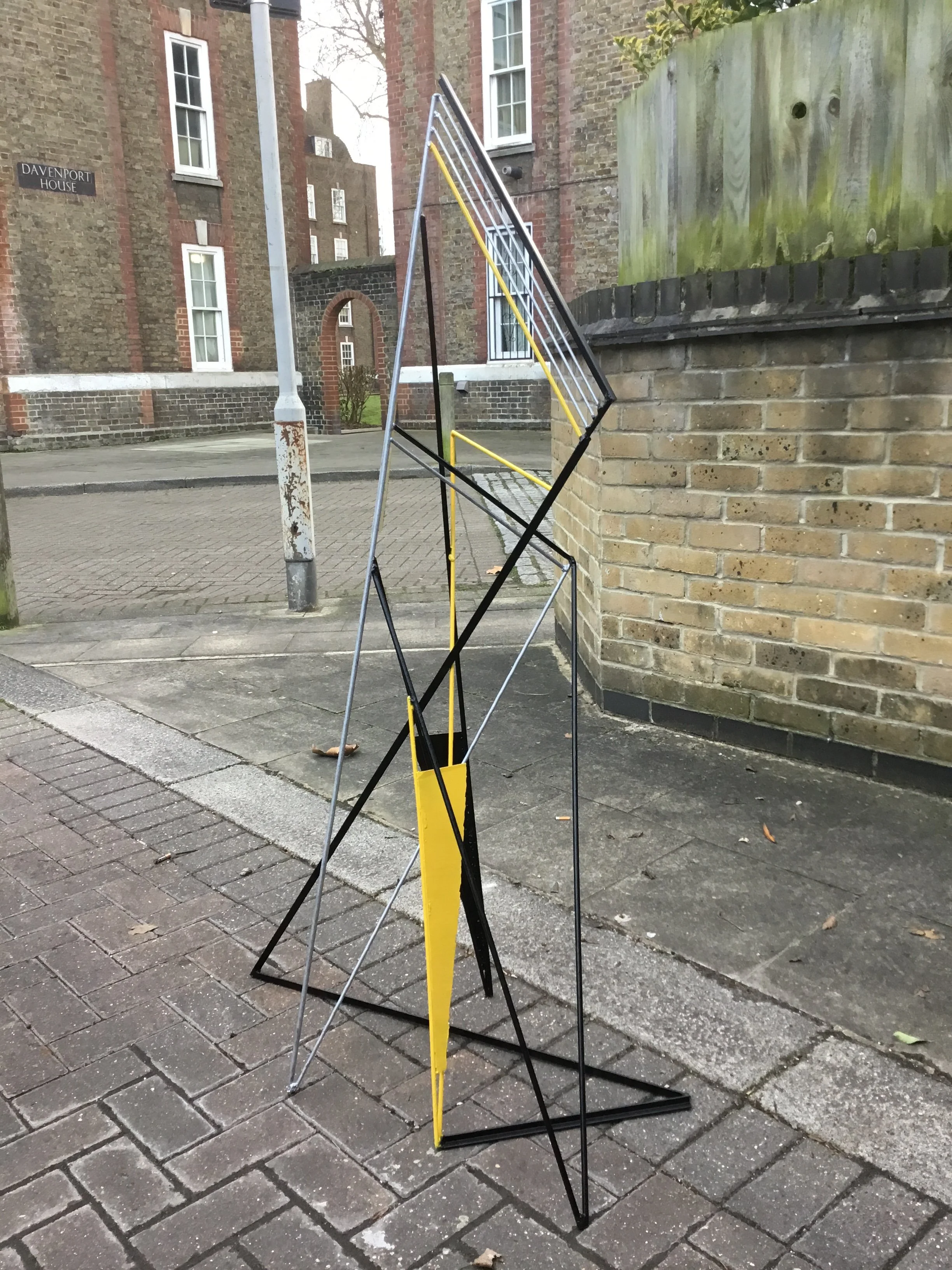 Grounded, 2020, 155 x 95 x 45cm, painted steel. Winner of the Morley Gallery selectors’ choice prize in London, this piece was exhibited in the street level display windows of the Elizabeth House building, Waterloo, London, for 6 months.