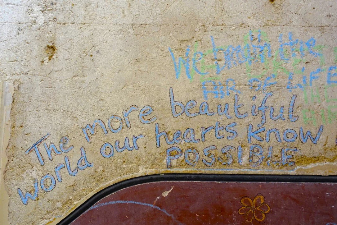 Change Gate, 2024, reclaimed sheep shedding gate, painted and stencilled with words around regenerative farming and the vested interests that oppose it. This piece is interactive.