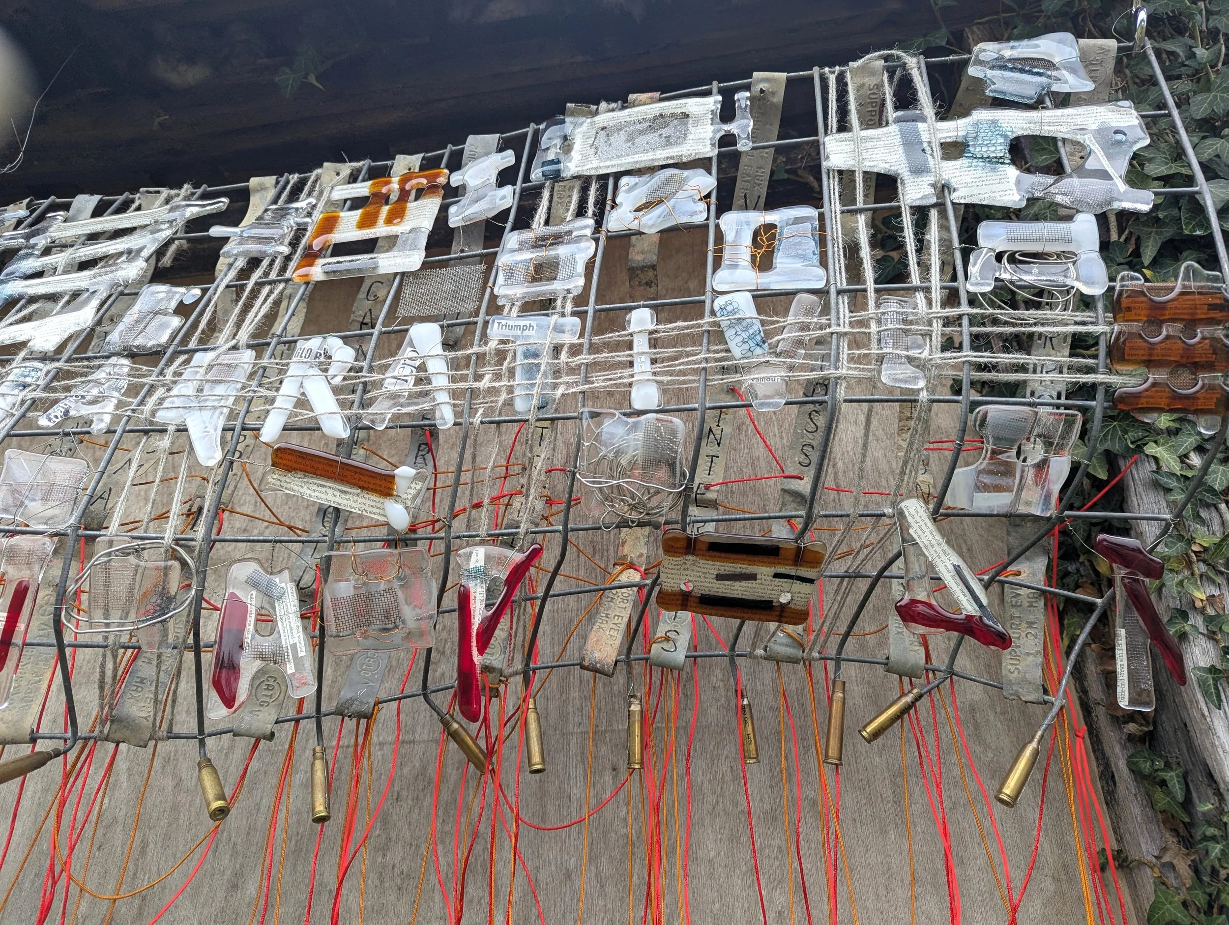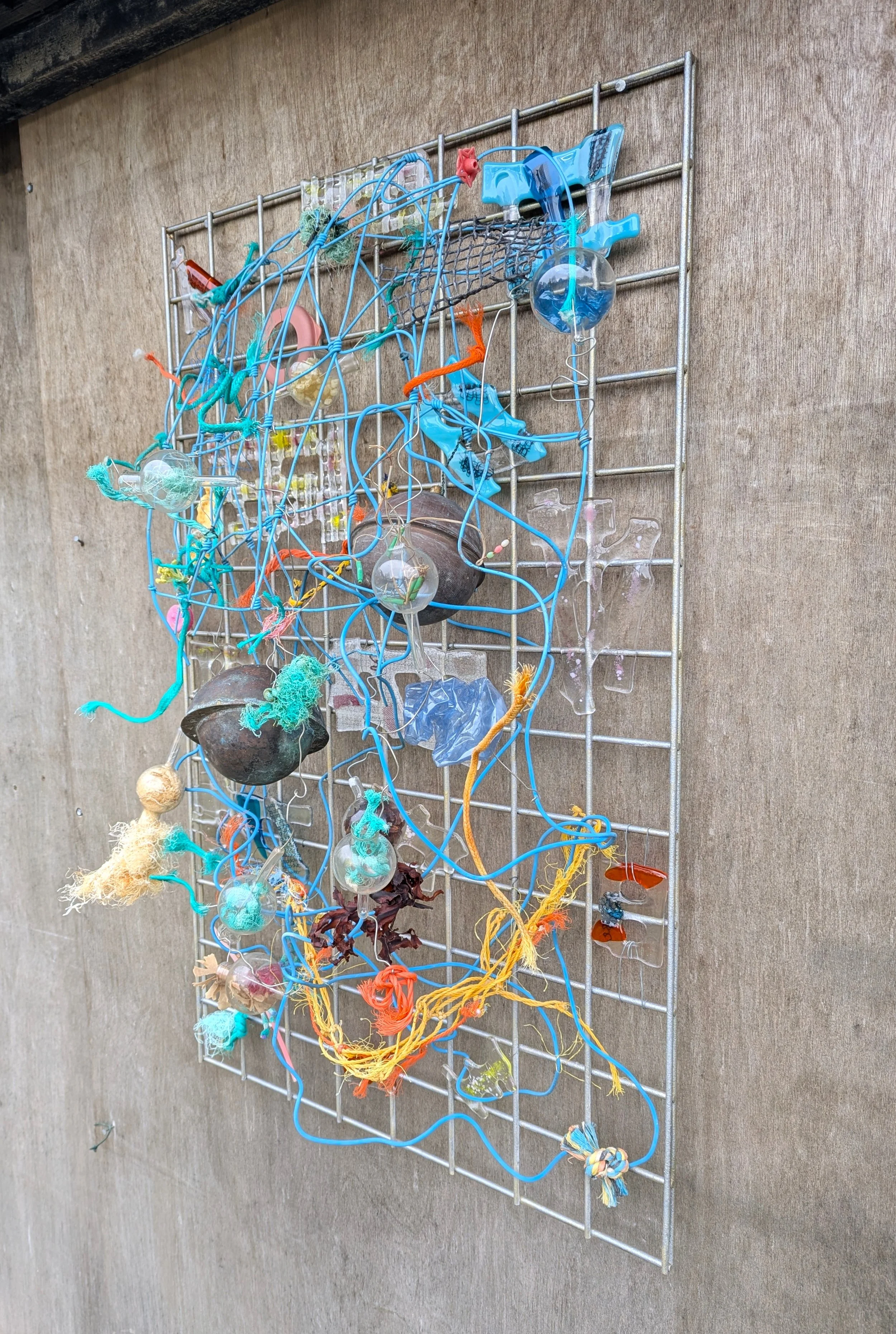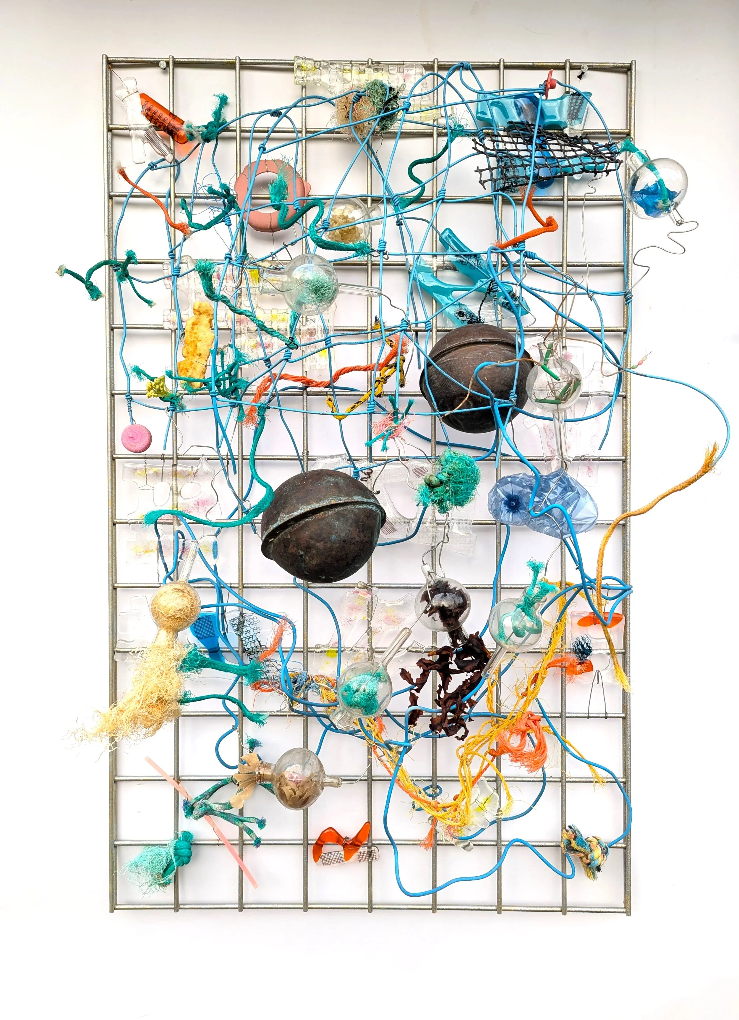 2026, reclaimed metal grid, glass feeders, fused glass panels, electrical cable, wire, ball cocks and beach finds.