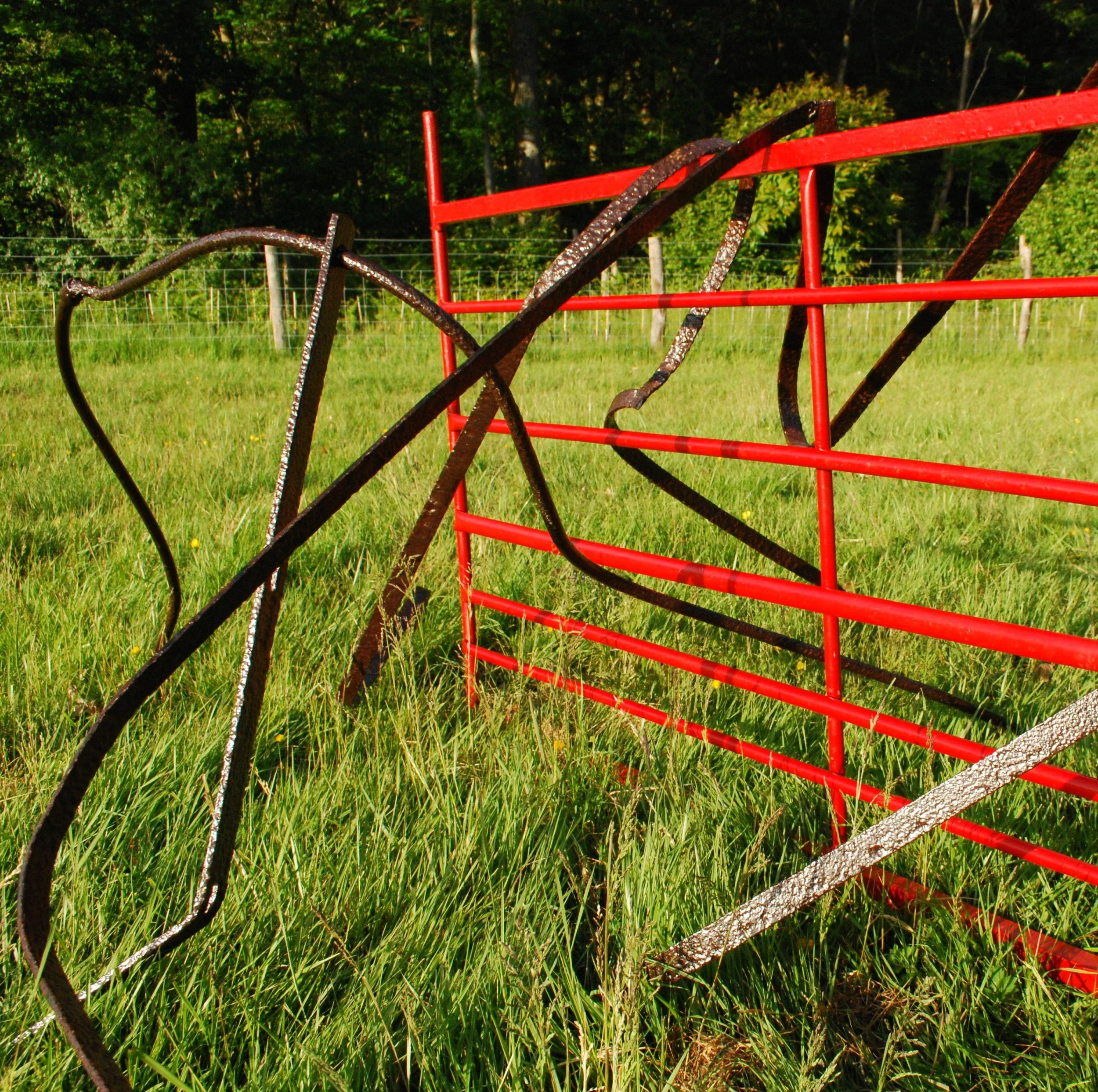 Coup d'Etat, 2023, reclaimed farm gate and unearthed fence parts. The fence rebels against the authority of the gate. A commentary on land enclosure and our conditioned deference to the discourse of private ownership.