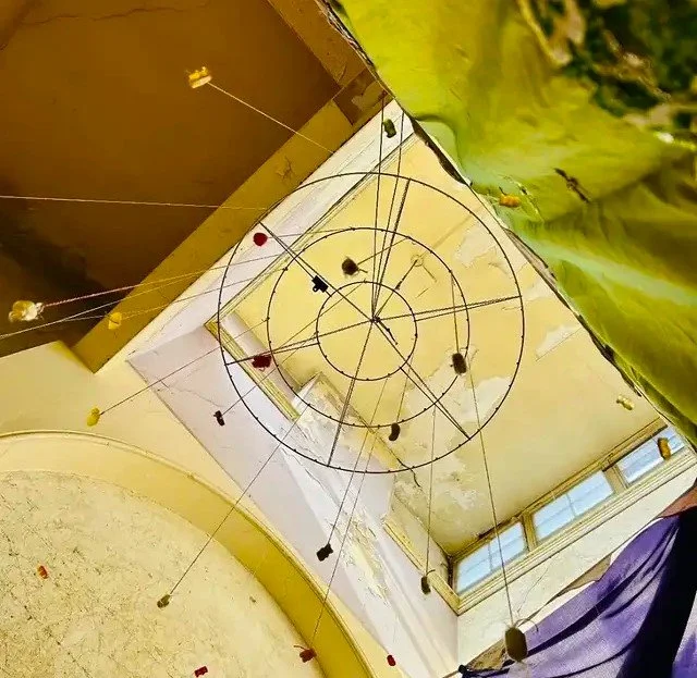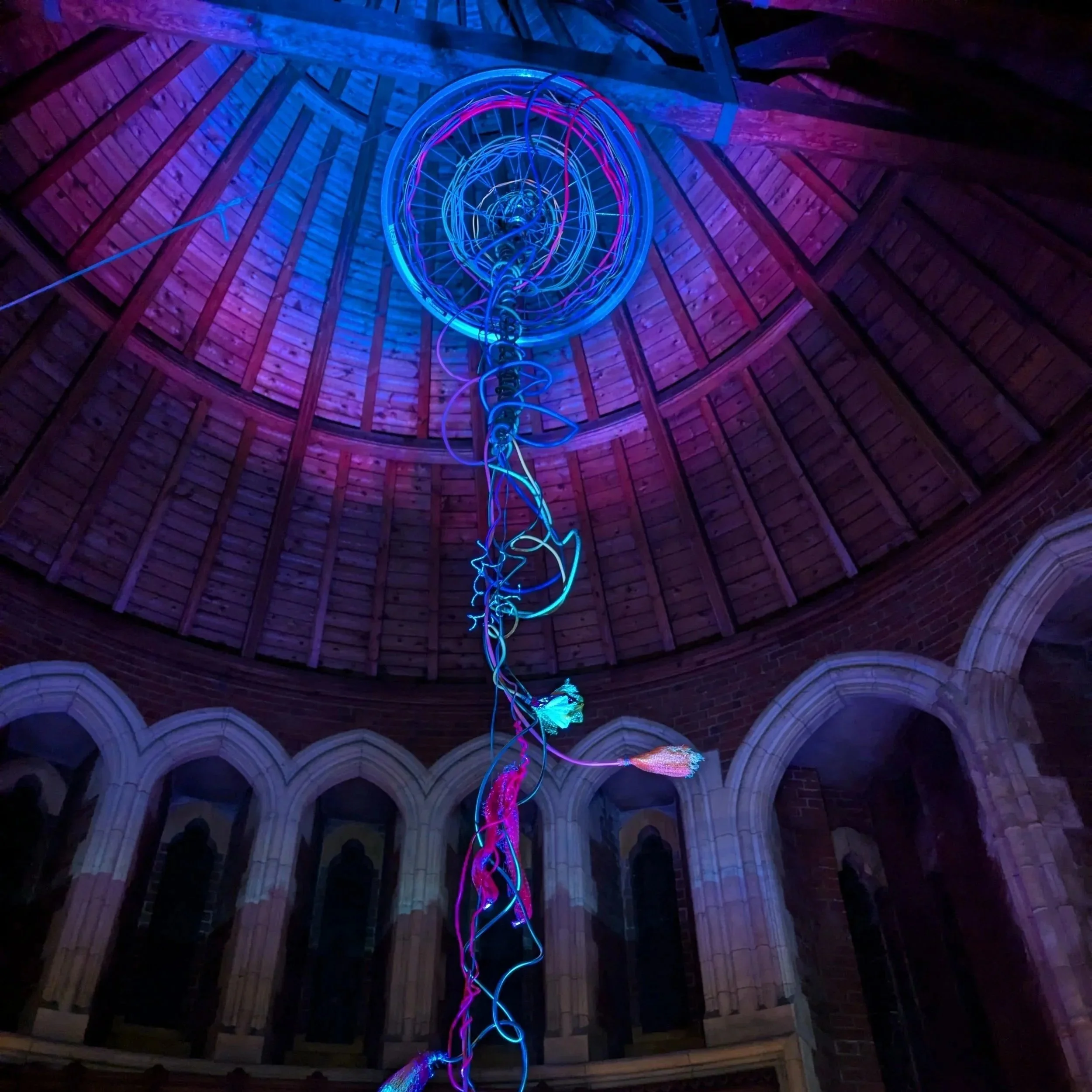 An installation was commissioned by St Matthias Church in Brighton for their carol service in December 2024. Lit from below, Power Lines conveys the dynamic relationship between humanity and the transcendent. Descending from a wheel which seems to hover in space, the upper and lower sections spiral towards each other like two tornadoes, connecting in the middle and yielding metaphorical blossoms. All the materials are recycled: a bicycle wheel, car suspension springs, electrical cable and fruit netting wrap.