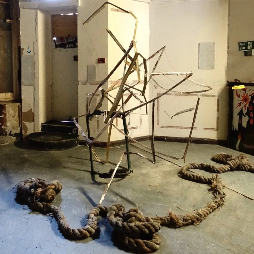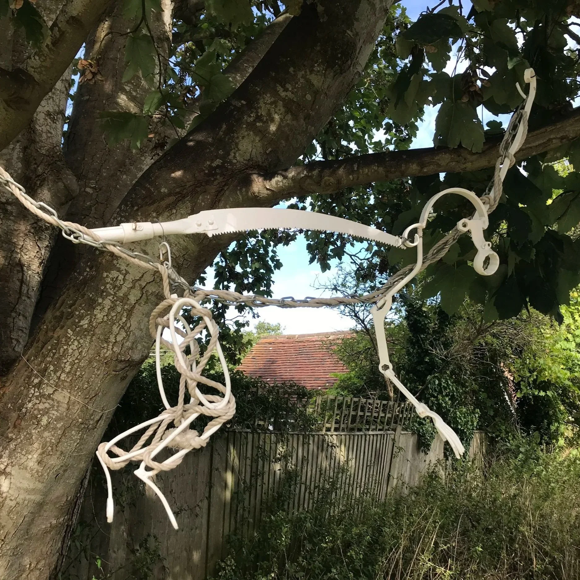 An installation for the gardens of St Johns Waterloo, London, Ghost Monkeys was exhibited in a tall tree over summer 2024. The piece is made with loosely assembled rope, saws and chains.