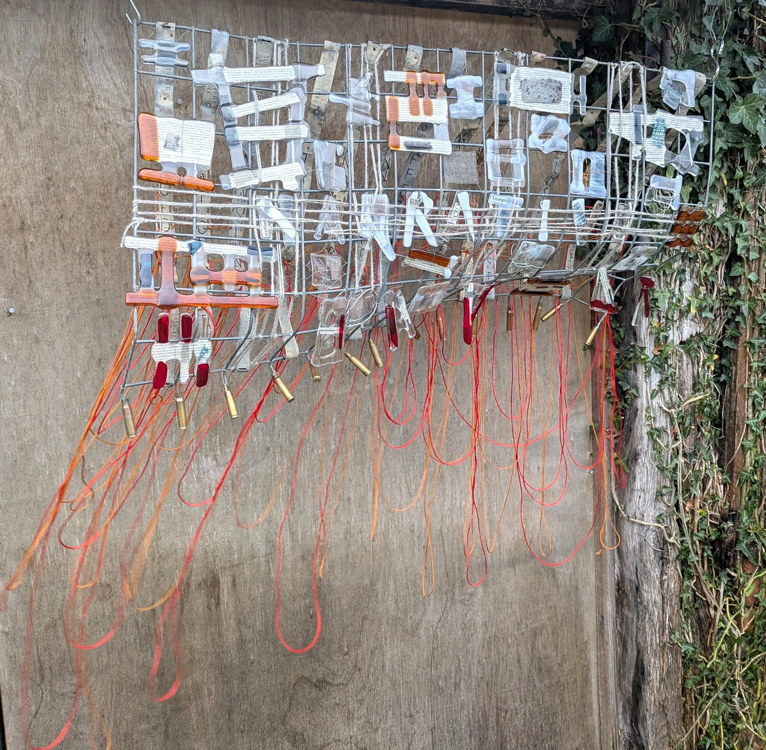 Woven Window, 2024, found metal grid, fused glass, electrical cable, fishing twine and found metal objects. Placed in front of an existing window in the farm dairy, this piece refers to the constructed mental grids and filters through which we view Nature.