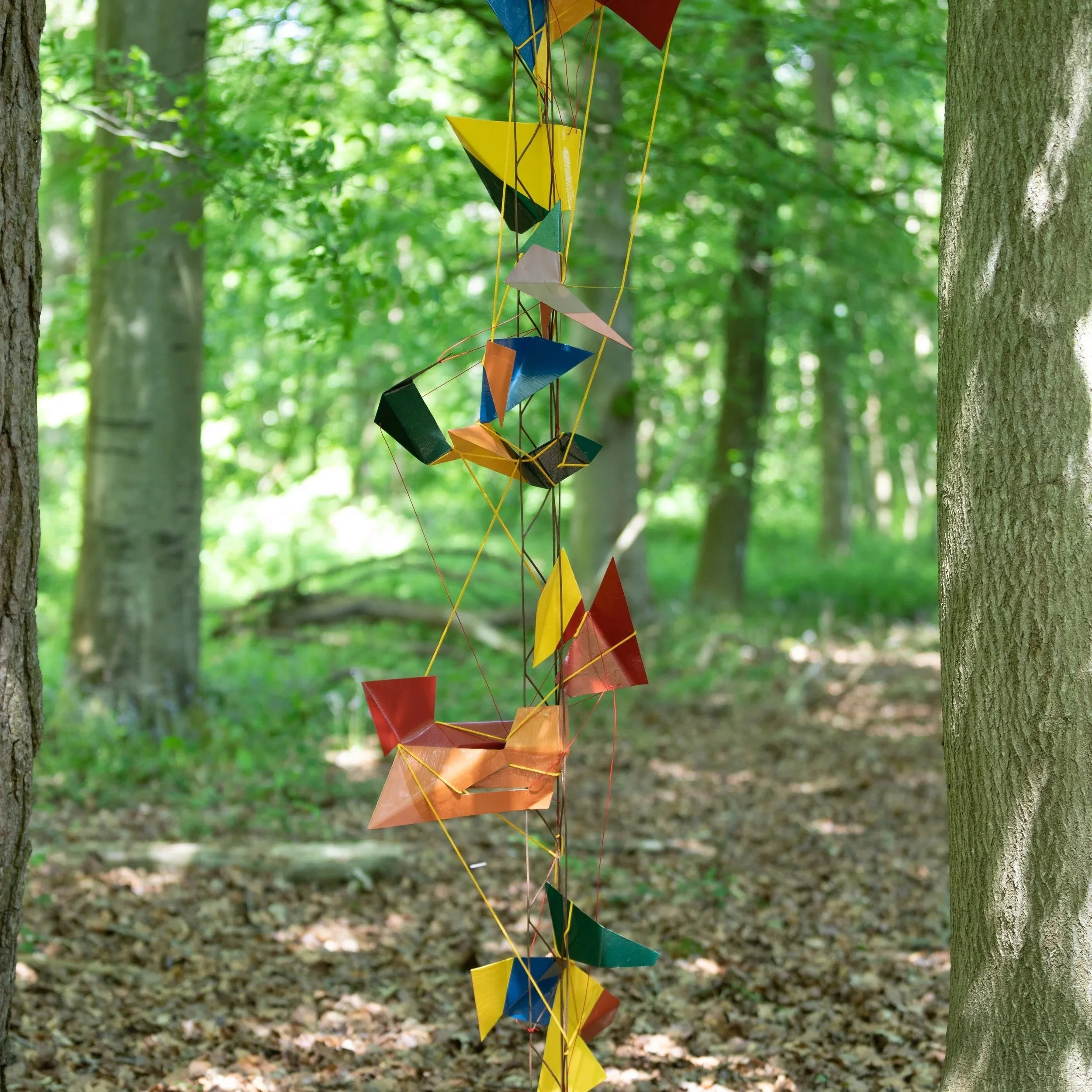 Tailspin, 2024, reclaimed metal truss, steel plate and coloured cord. A commentary on biodiversity, poised between nosedive and revival.