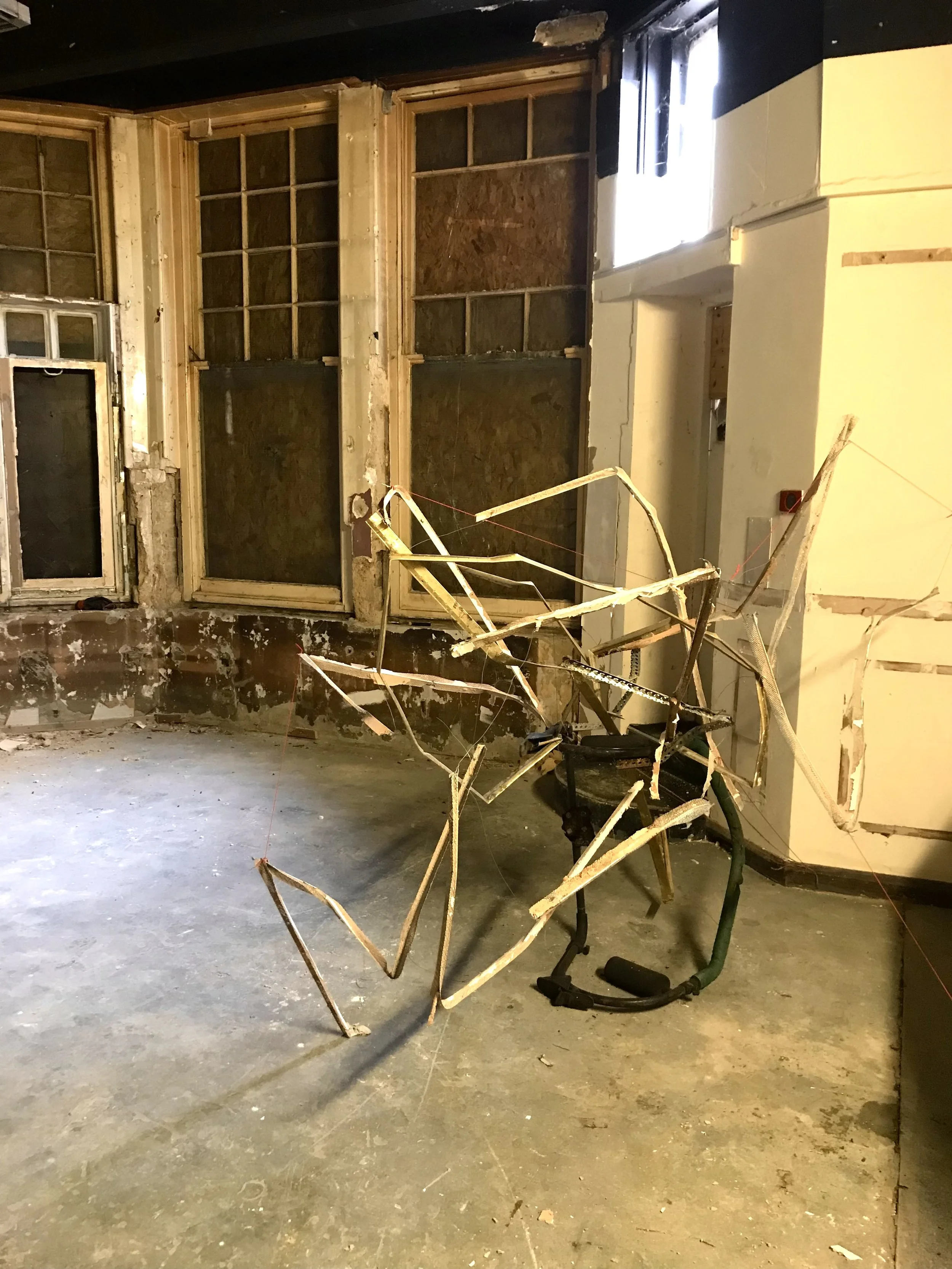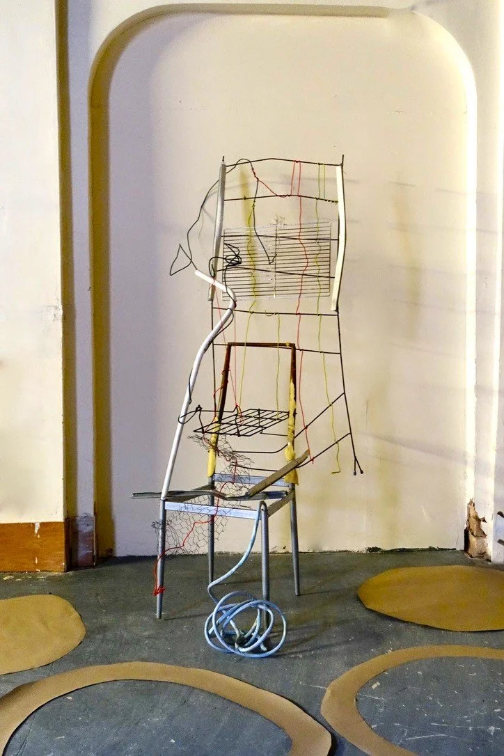 Made from salvaged materials including a mattress core, windscreen wipers, electrical cable and assorted springs, this piece was made for a shop window display on Lewes High Street to promote a local event. The figure is intentionally ambiguous, with references to ‘new life’ in Nature, the yoga asana known as ‘chair pose’ and the risen Christ springing forth from presupposed bodily destruction. Shown in the former Lewes Tourist Office, April 11-22nd, 2025.